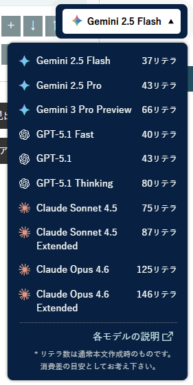 たとえば、自然な日本語表現に定評のあるClaudeモデルは、Gemini 2.5 Flashと比べて、リテラの消費量が約4倍になります。