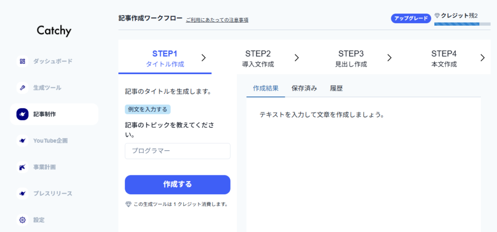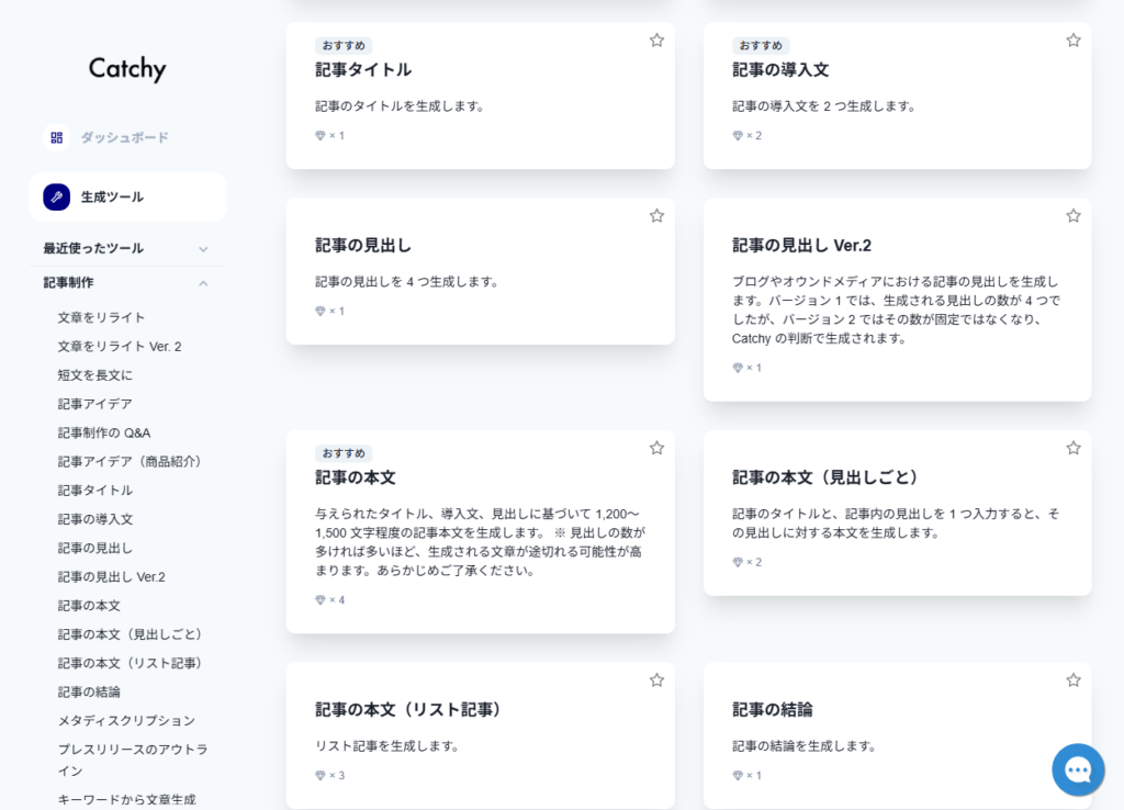 Catchy(キャッチ―)は、キャッチコピー、記事作成、SNS投稿、新規事業のアイデア出しなど、100種類以上の生成AIツールが利用できるサービスです。