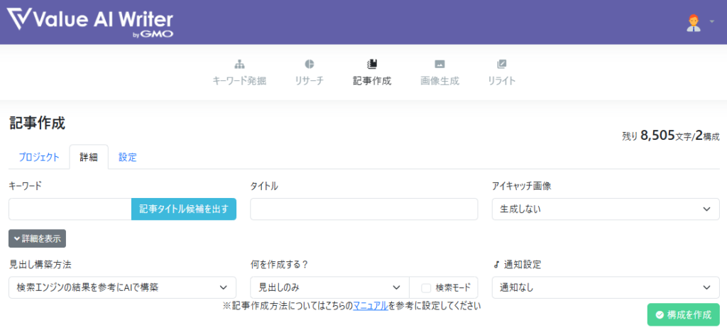 「Value AI Writer」は、GMOデジロックが提供しているブログ記事作成に特化したAIライティングツールです。