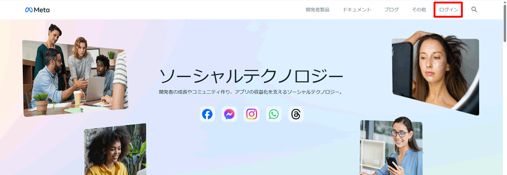 Meta for Developersサイトにアクセスして「ログイン」をクリックします。