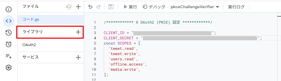 次に「コード.gs」の中にあるClient IDとClient SecretをTwitter APIで取得したものに変更して保存してください(上画像の灰色の部分)。