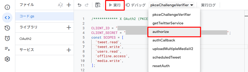 コード.gsを選択した状態で、リストから「authorize」を選択して、「実行」をクリックしてください。