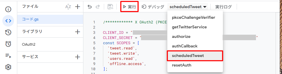 リストから「scheduledTweet」を選択して「実行」をクリックしてください。
